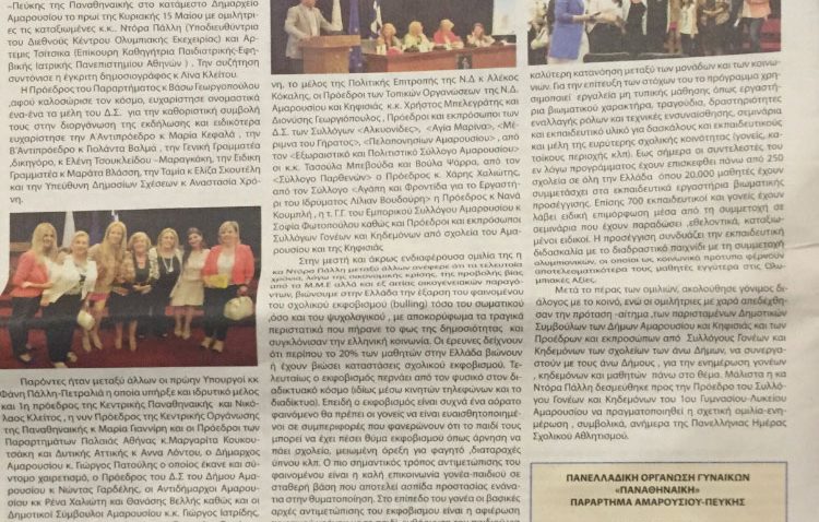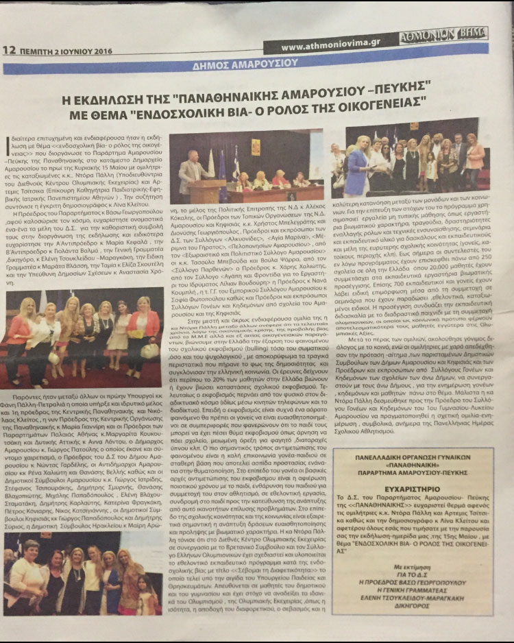 Θα ήθελα να ευχαριστήσω τον δήμο Αμαρουσίου για την φιλοξενία και την προεδρο της παναθηναικης οργανωσης παραρτημα Αμαρουσίου –Πεύκης και αγαπητή φίλη Βάσω Γεωργοπούλου για την πρωτοβουλία της σημερινής διοργάνωσης.