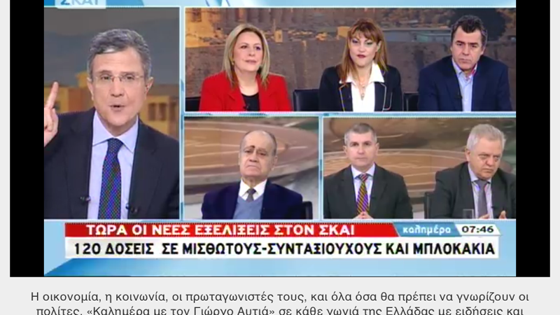 «Δεν μπορούμε να πανηγυρίζουμε έχοντας την μισή Ελλάδα να ζει με επιδόματα και μισθούς των 250 ευρώ ενώ η άλλη μισή Ελλάδα φτάνει να πληρώνει μέχρι 70% του εισοδήματός της σε φόρους και ασφαλιστικές εισφορές.» από την παρέμβαση μου στην εκπομπή Καλημέρα με τον Γιώργο Αυτιά.